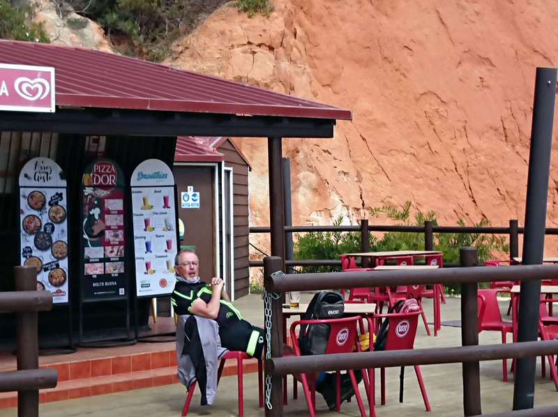 Abends entscheiden wir uns für das Restaurant auf dem Campingplatz, dort werden verschiedene Paellas angeboten. Ich gehe zur Bestellung hinein, eine Paella und ein Salat, den gibt es leider nicht, also nur Paella. 2 Bier dazu, macht 14,95€. Die Kreditkarte will das Gerät nicht, also zahle ich bar. Ein 50-€-Schein wird in einen Automaten eingezogen, dann rasselt es, das komplette Wechselgeld in 50 Cent-Stücken. Die gute Seele hinter dem Tresen hat Erbarmen, schaufelt alles in einen Bierbecher und geht damit in den Supermarkt. Dort steht ein Gerät, wo das ganze Kleingeld reingeschüttet wird, und dann erhalte ich 3 Zehn-€-Scheine, einen 5-€-Schein und etwas Kleingeld. Die Paella ist alles andere als gut und hat mit Paella nichts gemeinsam. Also – morgen gehen wir in den Ort, schlimmer kann es nicht werden.