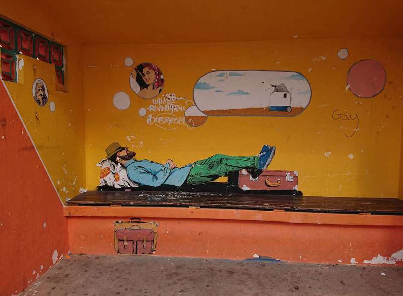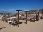 Die Bushaltestellen sind sehenswert, weiße Häuschen mit blauen Fensteröffnungen. San Luis ist einer der wenigen Orte auf der Strecke, wie üblich kleine Gassen und eine weiße Kirche mit eckigem Kirchturm. Ein Bier bekommen wir tatsächlich auch. Bei der Weiterfahrt auf guter Straße kann man den Blick schweifen lassen. Nur die letzten 10 km auf einer Schnur geraden Straße gefällt uns nicht mehr. Den Abend verbringen wir in einem Lokal direkt an den Dünen.
