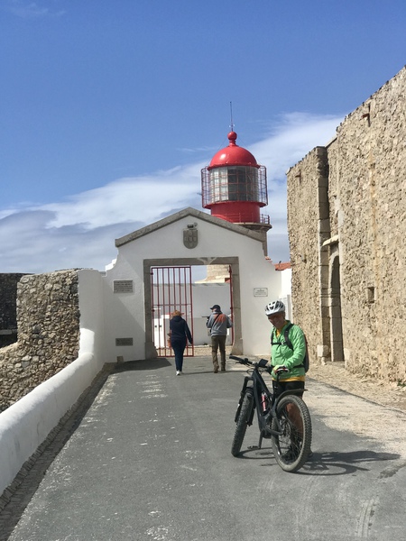 Wir wollen endlich das Ende des europäischen Kontinents erreichen und fahren über Vila do Bispo mit einem Camperstellplatz bei Lidl – Alternative falls der Campingplatz in Sagres voll ist – nach Sagres. Der Campingplatz Orbitur ist in einem kleinen Wäldchen gelegen, das ist auch gut so, da der Wind hier sehr heftig weht. Als Schattenspender sind die Bäume im Sommer sicher sehr willkommen. Da zur Zeit gerade mal die Sonne scheint, schwingen wir uns auf die Räder und steuern zum Leuchtturm Cabo de Sao Vicente. Nach den Parkplätzen zu urteilen, ist hier an den Wochenenden sicher die Hölle los und am Stand „Letzte Bratwurst vor Amerika“ ebenfalls. Die Steilküste ist beeindruckend und in den Buchten ringsum sieht man Surfer. Aber sonst gibt es hier nichts. Gegen den Wind fahren wir wieder zurück nach Sagres, der Ort bietet nicht viel, der Hafen ist definitiv kein Yachthafen, es dümpeln nur ein paar kleine Fischerboote herum. Zurück am Camper tröpfelt es schon wieder, wir planen für morgen die Weiterfahrt.