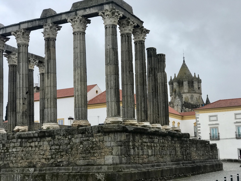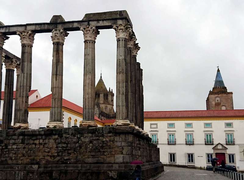 Ostern steht vor der Tür, da überlegen wir, dass es vielleicht im portugiesischen Hinterland entspannter zu geht. Wir wollten Evora gerne nochmal sehen, da uns die Stadt bei unserem Besuch in 2009 sehr gut gefallen hat. Je weiter wir Richtung Osten fahren, um so bewölkter wird es. In Evora parken wir auf einem kostenlosen Stellplatz am Ortsrand, der erstaunlich voll ist. Von hier aus ist es zur Altstadt nur noch 1 km. Wir machen uns auf den Weg und nach 100 Metern fängt der Regen an. Auf dem sehr heftigen Kopfsteinpflaster wirkt der Regen besonders gut. Trotzdem laufen wir die Sehenswürdigkeiten ab, wobei Fotos bei dem grauen Himmel keinen großen Sinn machen. Wenigstens findet Rüdiger noch die von ihm gewünschten Sandalen, dann kaufen wir noch schnell etwas ein und verziehen uns in den Camper. In der Nacht trommelt wieder der Regen aufs Dach, nah prima!