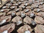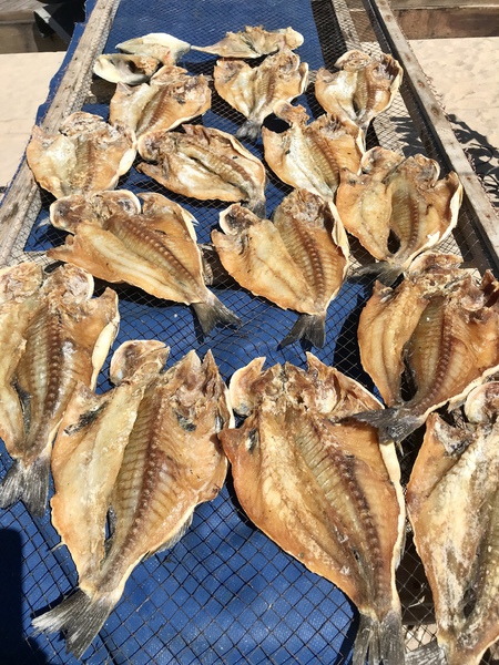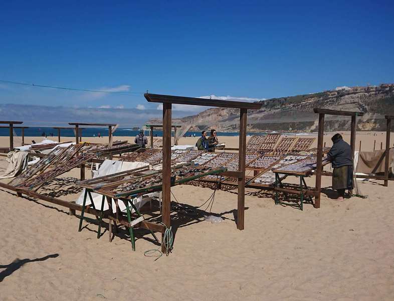 Auf der Höhenstraße fahren wir dann zurück nach Nazaré. Am Strand „riechen“ wir einen Fischmarkt, die Fische liegen auf Gittern zum Trocknen aus – sehr beeindruckend.