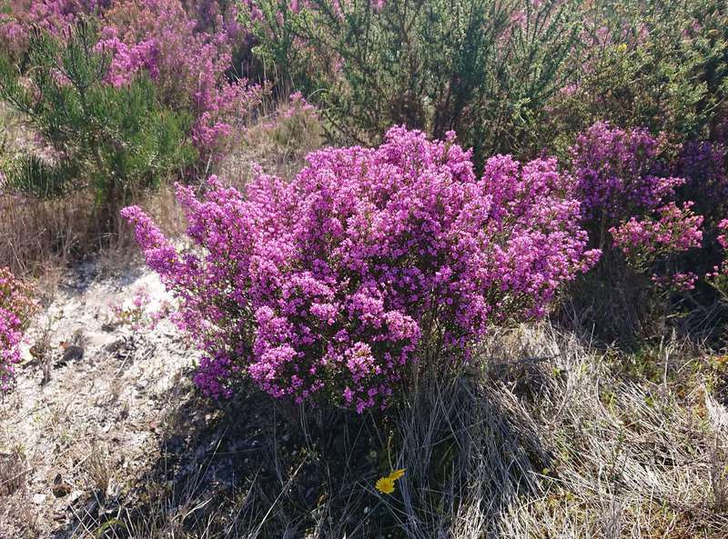 Die Richtung nach Figueira ist mit dem Rad schlecht zu fahren, da nur eine autobahnmäßige Straße über den breiten Fluss führt. Also ab Richtung Süden, auf kleinen Straßen durch kleine Orte schlängeln wir uns durch die Landschaft. Der Sturm ist überall noch gegenwärtig. In den Vorgärten blühen Pflanzen, die wir bei uns für viel Geld nur in Blumenläden erhalten, sehr schön anzusehen. Dann gibt es eine Art Heidelandschaft, Heidekraut in kräftigen Farben leuchtet uns entgegen. Zurück am Campingplatz bezahlen wir noch für eine weitere Nacht und kaufen die Mitgliedschaft bei der Orbitur-Campingplatzgruppe, so erhalten wir immer 20% Rabatt, mit 5 Übernachtungen hat sich das schon rentiert. Nach der Erfahrung von gestern Abend gehen wir heute Mittag essen, die beiden guten Lokale sind voll mit Reservierungen, im Ort finden wir ein unscheinbares Lokal, einige Gäste darin sehen recht zufrieden aus. Wir bestellen aufs Geratewohl und erhalten ein Spitzen Essen. So soll es sein. Den Nachmittag verdauen wir in der Sonne.