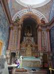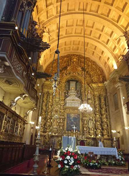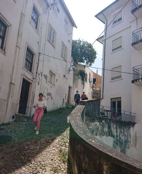 Wir sind mutig und wagen es, ins Hinterland zu fahren. Nachdem es an der Küste kalt und bewölkt ist, sind wir angenehm überrascht, in Coimbra Sonnenschein und Wärme zu spüren. Also unternehmen wir einen ausgiebigen Bummel durch Coimbra. Wie üblich ist ein Kilometer langweilig an der Straße entlang, dann kommt die Altstadt mit Fußgängerzone, schönen Geschäften und richtig viel Leben. Zur Oberstadt führen Treppen hinauf, ich habe sie leider nicht gezählt, aber es waren viele! Die hiesigen Kirchen öffnen die Pforten nur zum Gottesdienst, in die erste schaue ich nur kurz hinein, bei der Kathedrale oben auf dem Berg ist die Messe gerade vorbei und man kann in Ruhe hinein gehen. Eine Taufe hat es auch noch gegeben, die Bilder werden gerade gemacht.