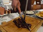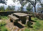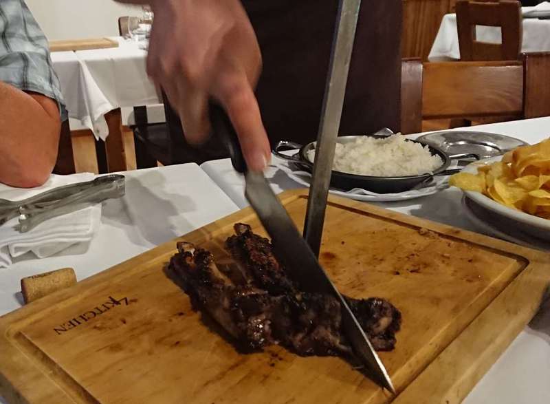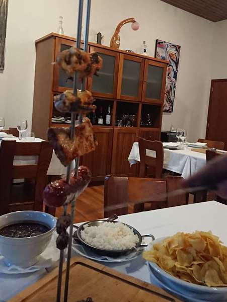 Da es hier keinen gescheiten Campingplatz gibt, fahren wir weiter nach Vouzela, der dortige Campingplatz soll sehr schön sein. Durch den Ort ist die Fahrt bereits abenteuerlich, danach geht es in steilen Serpentinen durch einen Eukalyptuswald mit riesigen Bäumen auf ca. 500 Meter hoch – ganz herrlich gelegen und warm!! Ein Restaurant ist direkt vor dem Campingplatz und dem Parkplatz nach zu urteilen ist es wohl sehr gut. Um 19:30 Uhr nehmen wir als erste Platz, die Speisekarte ist nicht besonders groß, aber es gibt ein Menü für 17,50 €. Den Salat kann man sich am Buffet selbst nehmen. Dazu gibt es unterschiedlichstes Fleisch „all you can eat“. Aufgespießt und gegrillt kommen immer 2 bis 3 verschiedene Brocken, werden am Tisch zerlegt, dazu gibt es schwarze Bohnen, Kartoffelchips und Reis. Nach dem 3. Gang streiken wir, da kommt noch eine gegrillte Ananas zum „neutralisieren“, auch sehr lecker. Da bleibt nur noch Platz für einen Brandy.