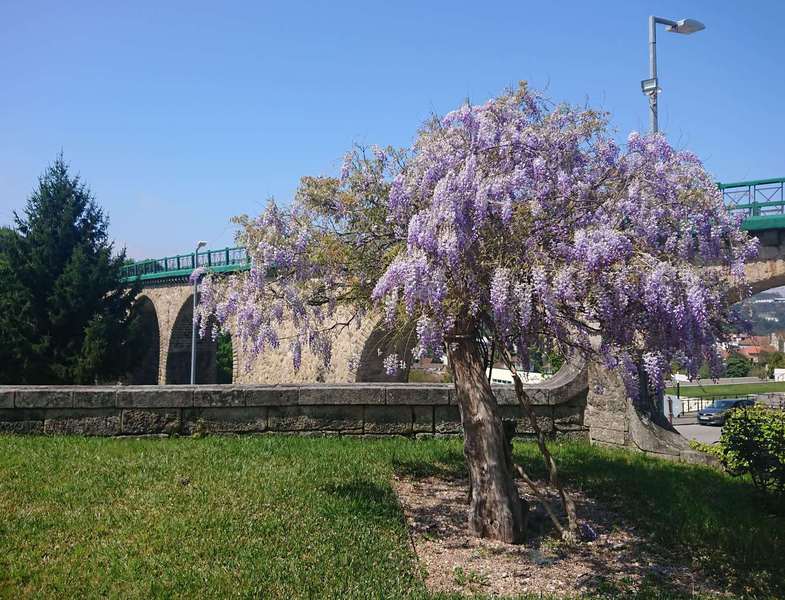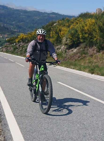 Am nächsten Morgen ist es nebelig. Der blaue Himmel kündigt einen schönen Tag an – wenn der Nebel weg ist. Es dauert bis 11 Uhr, dann starten wir zu einer sehr schönen Radtour. Die Gegend ist schon fast alpenmäßig. Felsbrocken liegen am Hang, dazwischen gibt es wieder viele Blumen und gelber Ginster. Irgendwann landen wir auch in Vouzela. Dort wurde eine Bahntrasse zum Radweg ausgebaut. Die historische Innenstadt ist zwar klein, aber sehr schön. Und dann beginnt der Anstieg zum Campingplatz. Nach 16 km haben wir gut 400 Höhenmeter auf der Uhr.