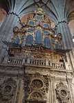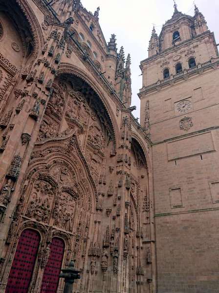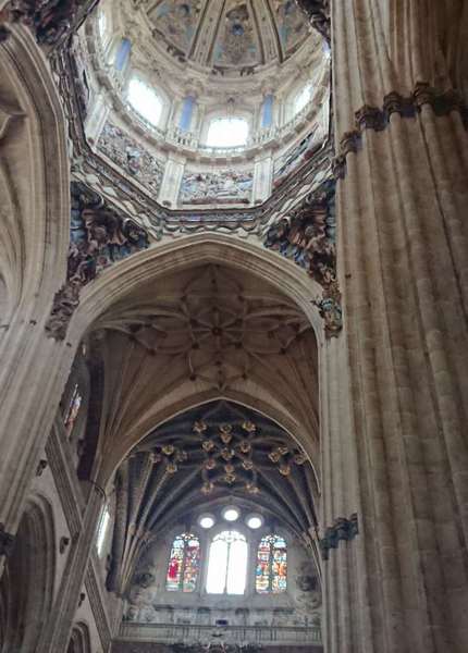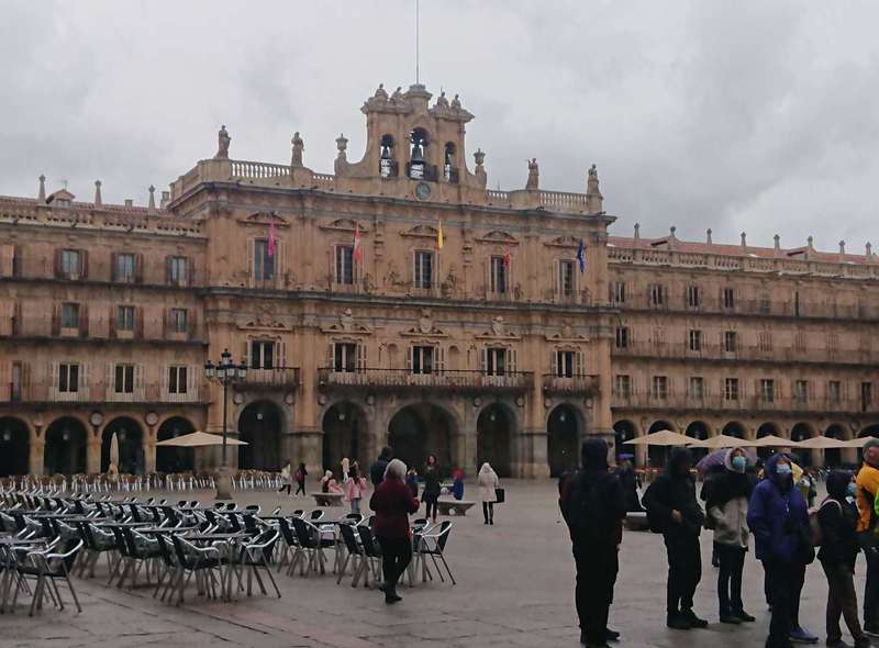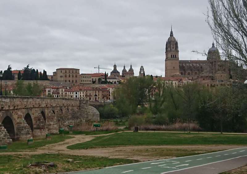 Wir verabschieden uns aus Portugal, noch bei blauem Himmel. Der Weg bis zur spanischen Grenze ist sehr bergig, herrliche Felslandschaften mit Ginster und auch viel Wald sind zu sehen. Nach der Grenze wird es schlagartig langweilig, große Felder, weite Ebenen und zu allem Überfluss viele Wolken. Egal, wir möchten uns nochmal Salamanca ansehen. Direkt am Fluss finden wir einen Parkplatz, den wir uns mit mehreren Campern teilen. Beim Ein- und Ausparken hilft man sich gegenseitig, egal welche Nationalität man hat. Bis zur Kathedrale ist es noch nicht mal 1 km, dann sind wir im Zentrum der Stadt mit den vielen herrlichen Sandsteinbauten. Für die Besichtigung der Kathedrale muss man inzwischen Eintritt bezahlen, zumindest für Rentner ermäßigt. Die gigantischen Säulen, vielen Altäre und traumhaften Deckengewölbe sind beeindruckend. Der anschließende Bummel durch die Altstadt ist ohne Sonnenschein nur halb so schön, die Plaza Mayor ist auch ein Muss, die Sonne denken wir uns. Dann fahren wir noch 25 km weiter zu einem einsamen Campingplatz.
