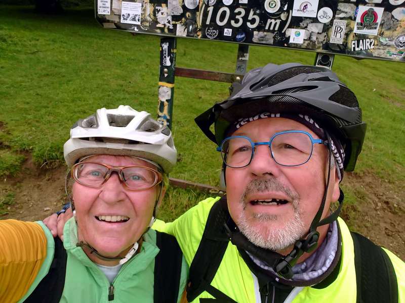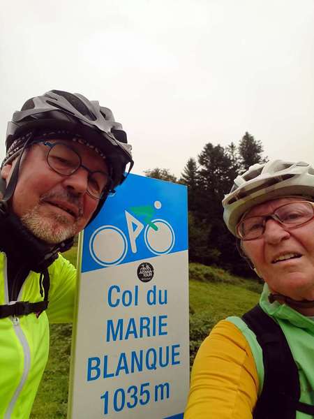 Montag früh ist es noch etwas nebelig und ein heftiger Wind weht. Wir warten deshalb bis 11 Uhr, schwingen uns auf die Räder und nehmen uns den „Col de Marie Blanque“ vor. Mit Serpentinen, die zu Anfang ca. 8 % Steigung haben, kurbeln wir langsam hinauf bis zu einem Hochplateau. Von hier aus sind es bis zum Col noch 3 km, aber recht flach. Man muss nur ständig auf Kühe achten, die quer über die Straße schlendern. Oben gibt es dann das Gipfelfoto und dann kommt die steile Abfahrt. Vor 20 Jahren haben wir den Berg von der anderen Seite angefahren und erinnern uns noch daran, dass die letzten 3-4 km brutal steil und schnur gerade aus führten. Als Abfahrt ist das herrlich, links und rechts gibt es Wasserfälle und es ist ein wirklich schöner Tag. Wir haben nur ein wenig den Rückweg unterschätzt, ein kleiner unscheinbarer Col quält uns noch arg. Aber die Tour ist ein Erlebnis.
