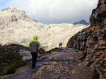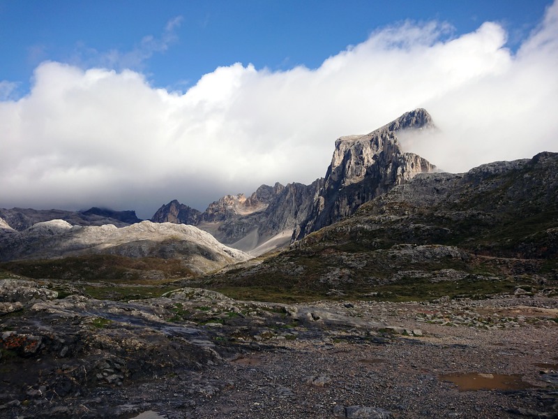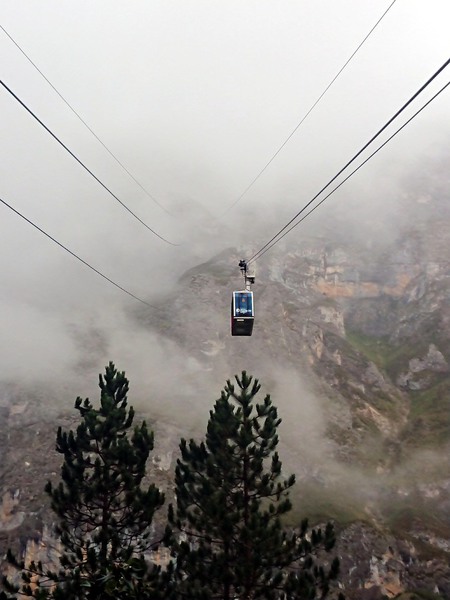 In Fuente De angekommen, sind die ersten blauen Flecken am Himmel zu sehen. Mit der Seilbahn geht es steil an den Felsen hinauf und oben kommt die Sonne raus. Die „Pico de Europa“ sehen fantastisch aus mit Licht und Schatten. Wir sind 1500 Meter höher als der Campingplatz liegt, entsprechend kühl ist es, aber die Luft ist klar und frisch und ein Spaziergang tut gut. Wieder zurück an der Seilbahn müssen wir auf Christine und Paul warten. Obwohl sie gefragt haben und es hieß, es brauchen nicht alle Teilnehmer eine eigene Fahrkarte zu haben, werden wir nicht in die Kabine gelassen. Entsprechend ist schon wieder die Stimmung in der Gruppe. Unten angekommen laufen wir zum Mittagessen in den „Parador“, wir hatten eine etwas andere Vorstellung davon. Die Vorspeise, eine gefüllte Aubergine, war sehr lecker, das Hauptgericht bestand aus einem kleinen ganzen Huhn mit Kartoffelscheiben, leider beides nicht richtig angebrachten. Was soll’s, wir haben bisher sehr gut gegessen. Morgen verlassen wir die herrlichen Berge.