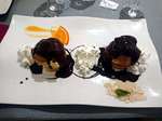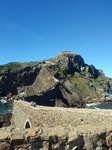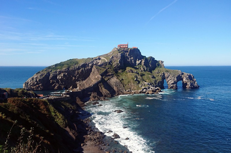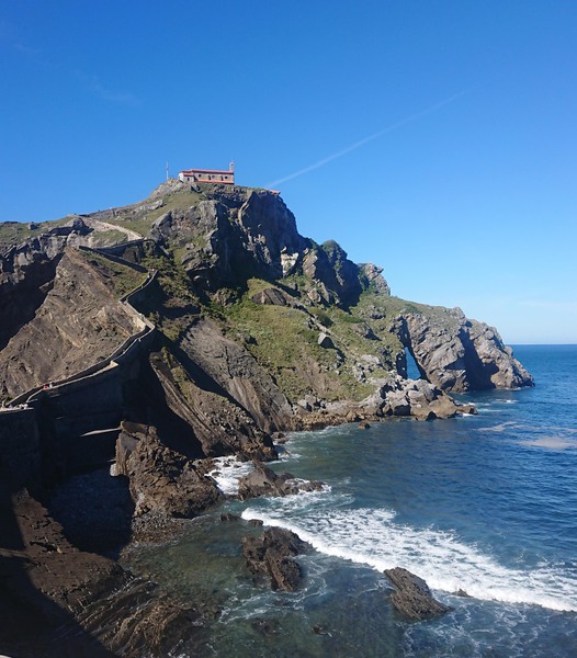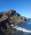 Anschließend geht es nach Gaztelugatxe zu einem Mittagessen der Meisterklasse. 3 hervorragende Vorspeisen werden von Fleisch (Bäckchen) oder Fisch (Thunfisch mit Garnelen) abgelöst, dann folgt noch eine Nachspeise, die fast keiner mehr schafft. Nach diesem üppigen Mahl wird uns eine sportliche Herausforderung angeboten, die Gelegenheit nehmen bei weitem nicht alle an und die Kapelle auf dem Felsen erreichen nur 5 aus der Gruppe. Auf ca. 2 bis 3 km führt ein steiler Weg nach unten zur Küste, dann kann man über eine Steinbrücke zum Felsen die Treppe hinauf mit ca. 350 Stufen zur Kapelle gehen. Die Treppen erspare ich mir. Die Rückfahrt mit dem Bus ist sehr ermüdend, die Klimaanlage zu kalt, so sind wir froh wieder im Camper anzukommen.