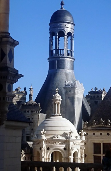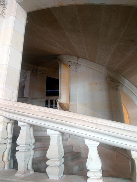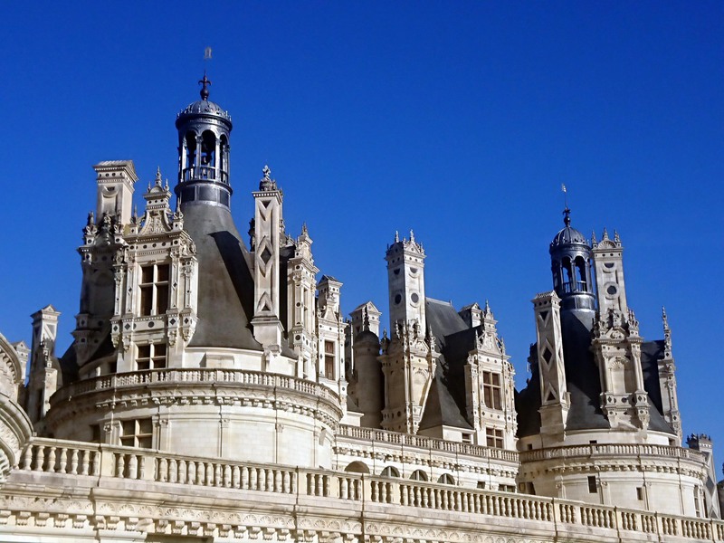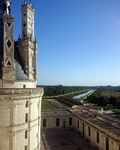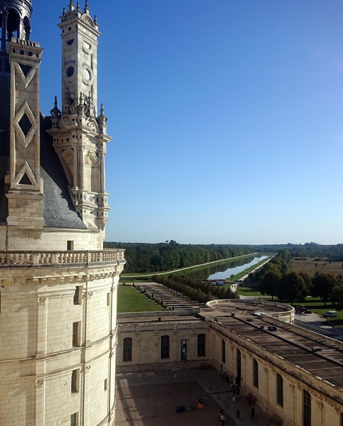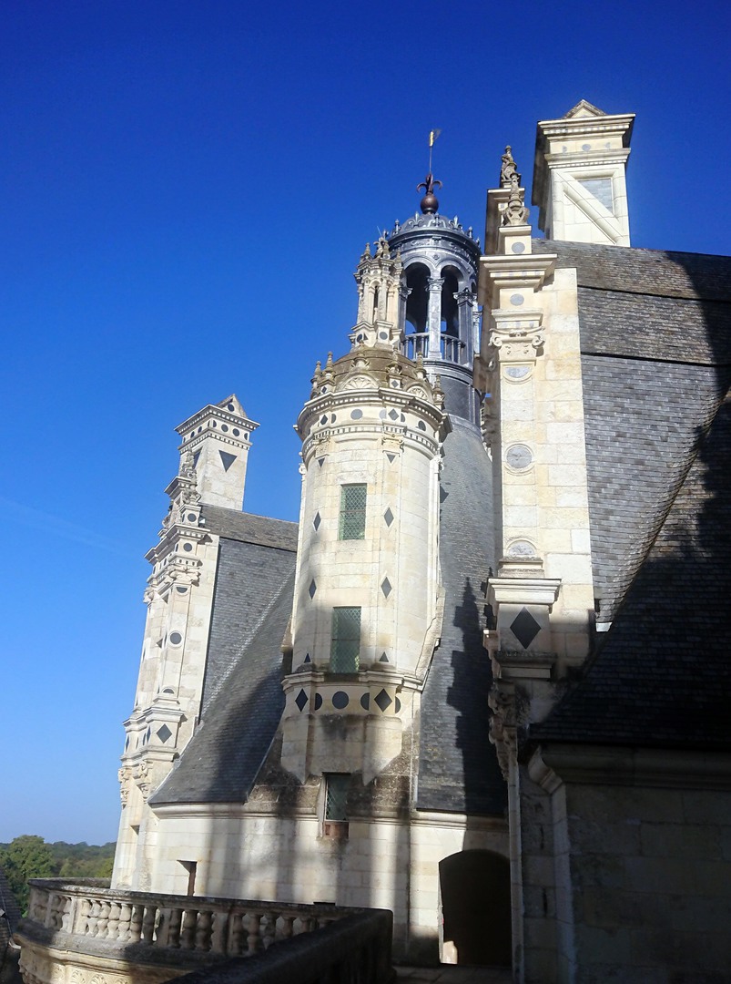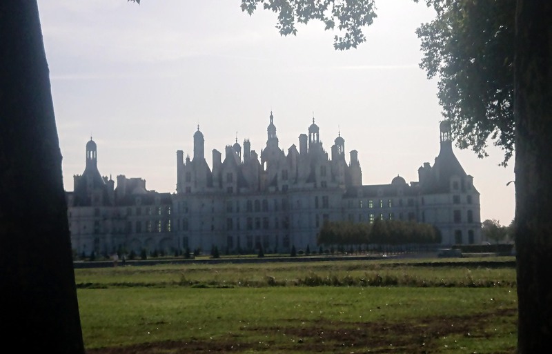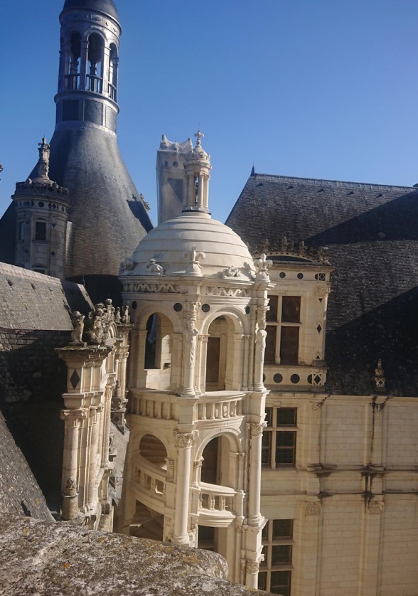 Bis zum Schloss „Chambord“ ist es nur 1 Stunde Fahrt. Man erreicht eine große Mauer mit einem Tor, der Eingang zum Park „Chambord“. Dann fährt man noch mal gute 5 km bis zu einer Allee, an deren Ende man die Türme des Schlosses sieht. Nun sind es noch 2 km bis zum Parkplatz und 1 km Fußweg. Mit anderen Worten, das Gelände ist riesig, das Schloss noch riesiger. Wir gehen zunächst über die Wendeltreppe bis zum 3. Stock. Dort kann man über Balkone das Gebäude umrunden und hat den kompletten Überblick über die Ländereien.