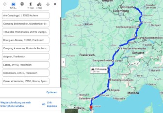 Der Arzt hat mir grünes Licht für den Urlaub gegeben, also starten wir durch, denn heute ist es wieder nebelig und kalt. Ich übernehme das erste Stück Fahrt, bei Offenburg tauschen wir und prompt fängt es an zu regnen. Zum Glück ist es nach der Rheinüberquerung in Frankreich wieder trocken und auch etwas wärmer.