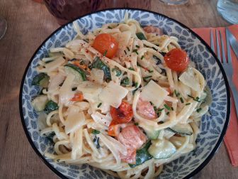 Die Fahrräder werden geladen, verladen und dann gibt es einen gemütlichen Abend mit Nudeln und Oliven-Kapern-Soße.