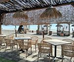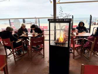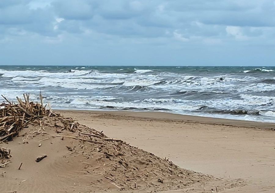 Um 11 Uhr hört der ganz große Regen auf, also noch einen Strandspaziergang unternehmen. Das Meer ist sehr rau, hohe Wellen klatschen an die Steine. Die Wege sind schlammig und rutschig, aber sonst ist alles gut. Die Kartoffeln auf dem Acker stehen glänzend. Zurück am Strand kehren wir ein, bei Karibikfeeling mit Großbaustelle im Hintergrund genießen wir die eine Stunde Sonne. Dann beginnt wieder der Regen. Heute Abend wird im Omnia Kartoffelgratin mit Lachs zubereitet.