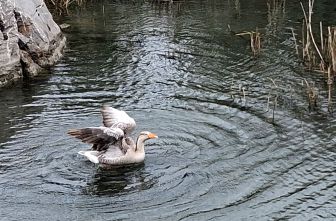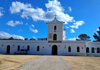 Der Wind treibt die Wolken auseinander, um 10 Uhr machen wir uns für eine Radtour fertig. Die ersten 3 km sind bestens asphaltiert, dann haben wir eine Schotterpiste mit Schlaglöchern voller Wasser, aber Richtung Hinterland weht kein heftiger Wind. Das ist sehr angenehmen. Zwischen Kühen hindurch wird der Weg etwas steiler, dann kommt der Abzweig Richtung Straße. Nur in einer Senke kurz vor der Straße fließt ein Fluss, vielleicht 5 Meter breit, aber die Tiefe kann man nicht einschätzen. Bevor wir mit den Rädern wegrutschen, schieben wir lieber hindurch. Bis zu den Knien reicht das Wasser. Der Wind bergab wird uns schon wieder trocknen. Zum Glück ist es recht warm. Dann besichtigen wir noch ein kleines Kloster mit schönem Innenhof und entscheiden uns dann für die kurze Abfahrt zum Campingplatz. Einmal nasse Füße reicht für heute.