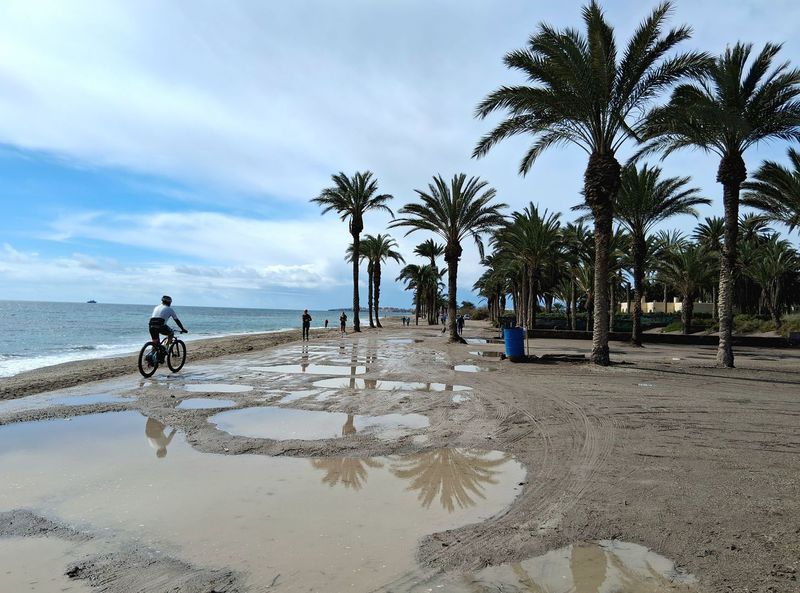 Heute soll es mal nicht regnen, aber über den Bergen hängen die dicken dunklen Wolken. Deshalb radeln wir nur gemütlich an der Küste entlang. Die Strandpromenaden werden überall geputzt und gefegt, man richtet sich auf die Saison ein. Am Ende der Tour gibt es eine kleine Tapabar mit vielen Spaniern. Dort kehren wir ein, essen 2 Baguettes mit Schinken und trinken 2 Kaffee, das Ganze für 5 €. Das sind doch mal angenehme Preise. Auf dem Campingplatz gibt es wieder das übliche Ritual, Fahrräder laden, verpacken, duschen und kochen. Dann regnet es wieder.