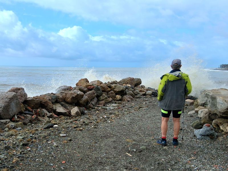 Morgens sieht es noch richtig gut aus, die Sonne scheint. Aber um 10 Uhr regnet es erst mal wieder. Es soll aber bald besser werden. Um 11 Uhr machen wir uns auf den Weg, am Strand entlang wie gestern und dann weiter darüber hinaus. Die Häuser an der Küste sind deutlich hübscher anzusehen als in den bisherigen Orten.