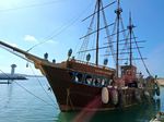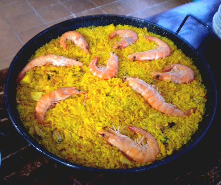 Das war es erstmal mit schönem Wetter. Heute ist es wieder grau und verregnet. Deshalb werden wir gleich anfangen, die Fahrräder und Planen zu verpacken, hoffentlich halbwegs trocken. Ab 17 Uhr ist Tourtreffen mit anschließendem Essen. Es gibt eine Meeresfrüchtepaella. Als Vorspeise serviert man uns Schinken und Käse, das ist in Ordnung. Die Paella besteht hauptsächlich aus Reis mit hin und wieder einer kleinen Krabbe, einer Muschel oder einem kleinen Tintenfischring. Der Pudding zum Schluss reißt es auch nicht raus. Die Wettervorhersage für Morgen ist ganz übel, es soll Sturm geben. Mal sehen, ob die Fähre überhaupt fährt.