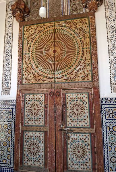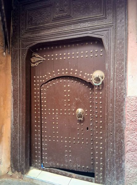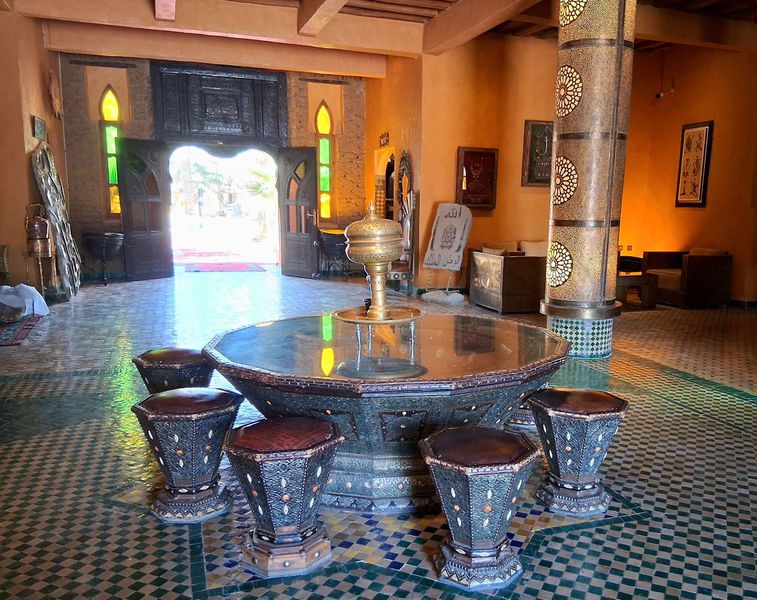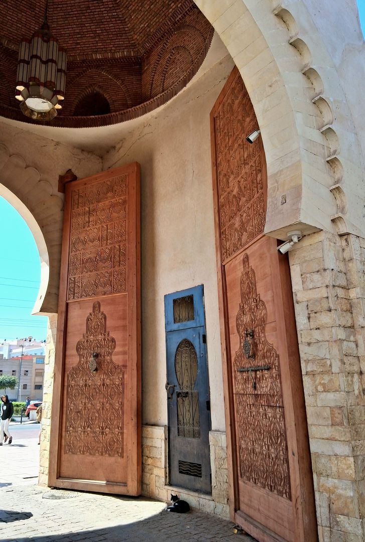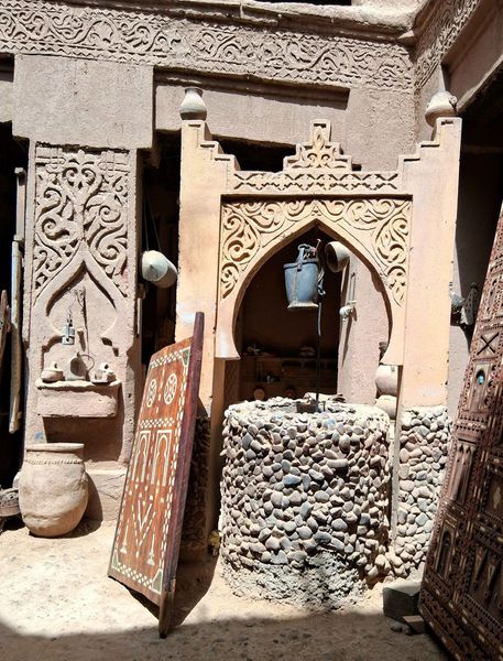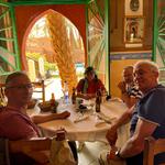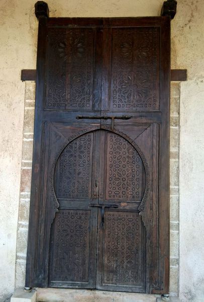 Besonders beeindruckend sind die schönen Türen mit Intarsien aus Dromedarknochen. Mittags geht ein Teil der Gruppe in ein sehr schönes Restaurant, wo trotz Ramadan für Touristen auch mittags ein Essen angeboten wird. Bis zum Campingplatz sind es nur noch 500 Meter, der Gang tut nach dem Essen ganz gut.