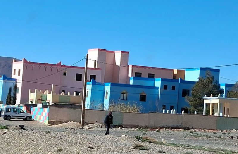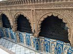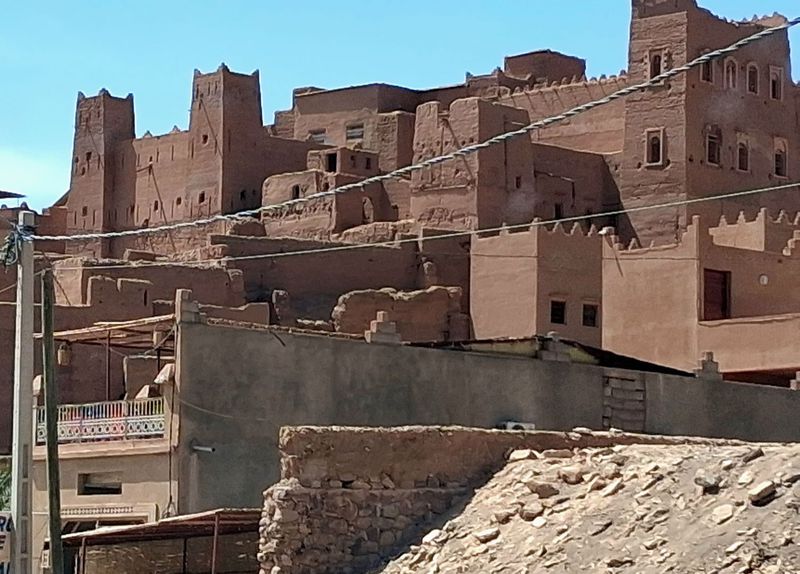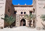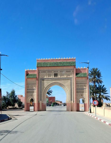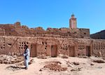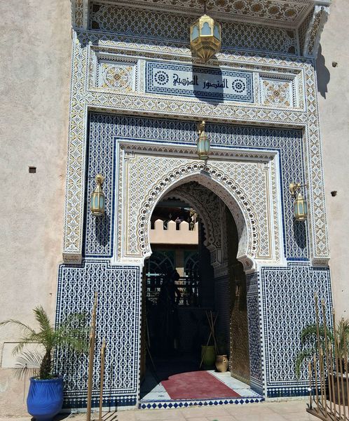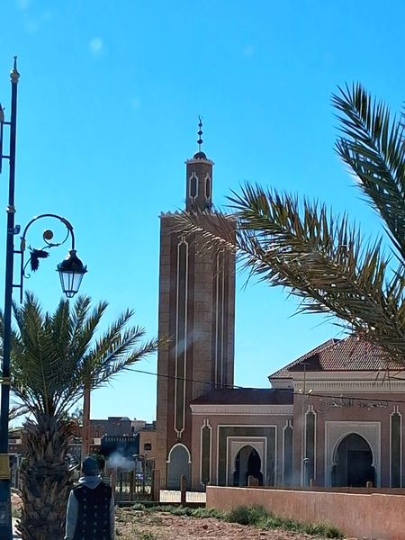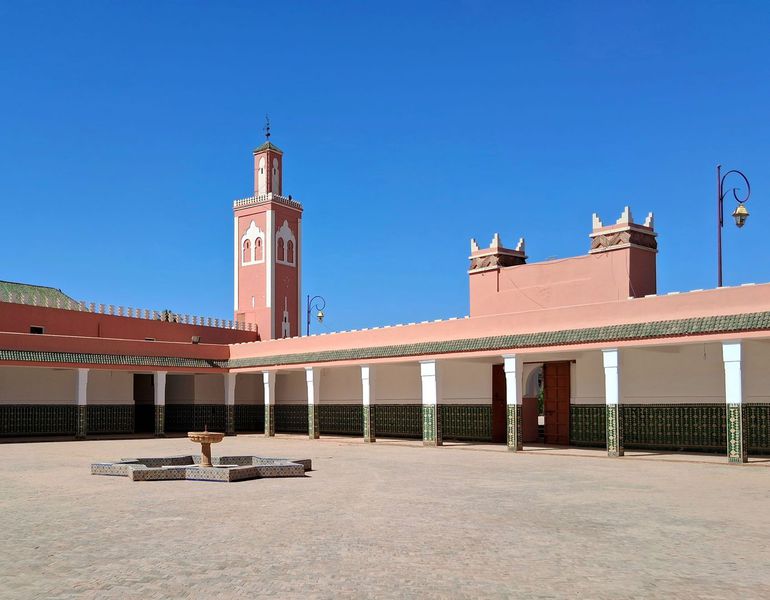Am Morgen brechen alle zusammen auf, da unser heutiges Programm um 10:30 Uhr im nur 20 km entfernten Ort Tamegroute beginnt. Bis die Karawane wirklich in Schwung kommt, dauert es eine Weile. Die Strecke ist schnell erledigt, dann treffen wir den heutigen Guide zusammen mit Hassan vor den Toren einer großen Bibliothek. Heute ist in Marokko Feiertag, Ende des Ramadan, da bleibt auch die Bibliothek geschlossen. Aber auch von außen ist das Gebäude mit angrenzender Moschee schön.