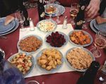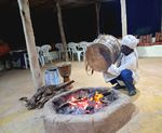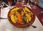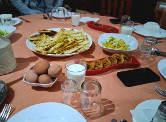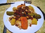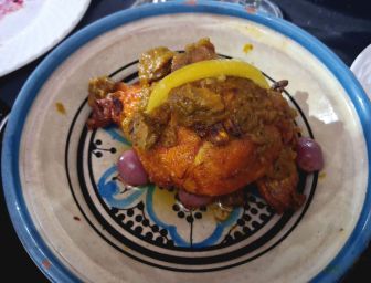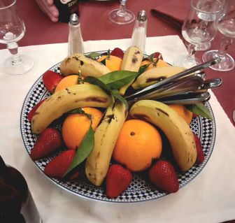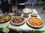 Das Essen ist wieder sehr würzig und reichhaltig, Vorspeisen, Huhn mit Hirse, Rindfleisch mit Pflaumen und Mandeln und anschließend noch Obst. Satt und fröhlich geht es zurück zum Campingplatz und um 12 Uhr nachts ist endlich Ruhe.