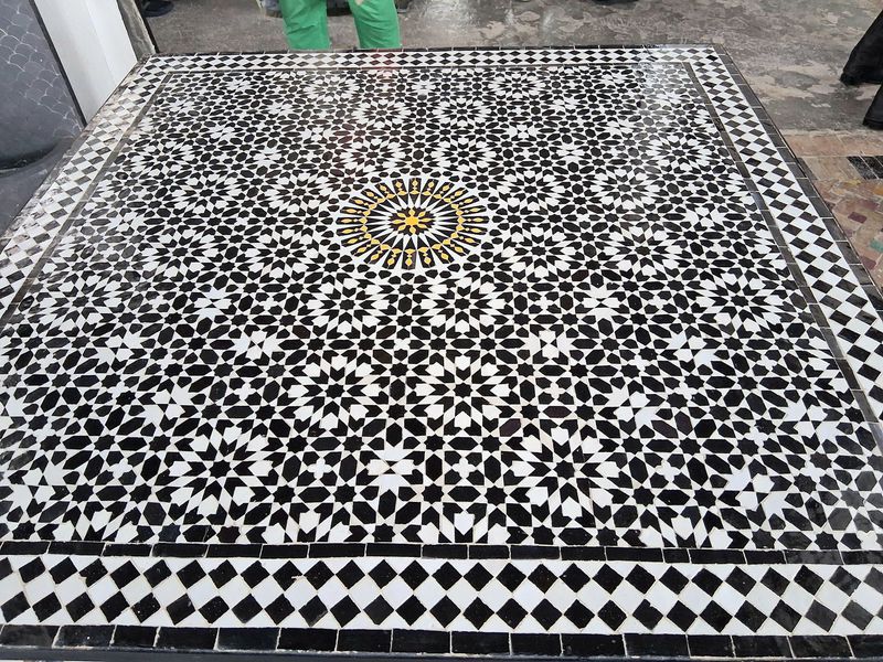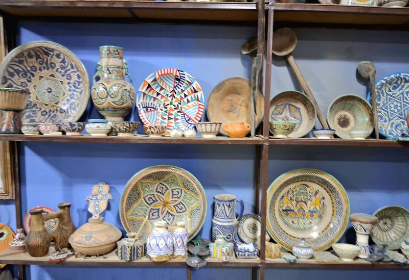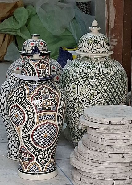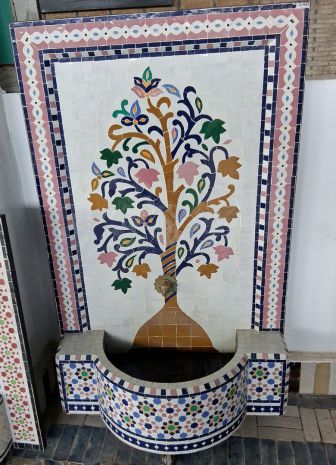 Weiter geht es zu einem Aussichtspunkt, um einen kompletten Überblick über Fes zu bekommen. Als erstes wird eine Keramikschule und -werkstatt besichtigt. Hier werden u.a. die Tajine und Schüsseln hergestellt, aber auch die Mosaiken für Brunnen, Tische, Wände etc. Aus kleinen farbigen Kacheln werden mit Hämmern die Mosaik-Steinchen gebrochen und geschlagen. Wir sehen uns beeindruckende Kunstwerke an.