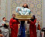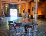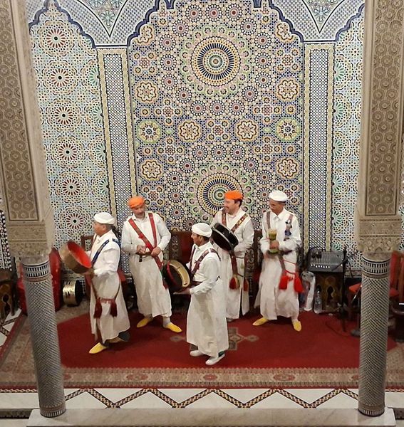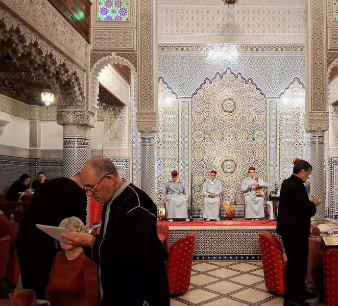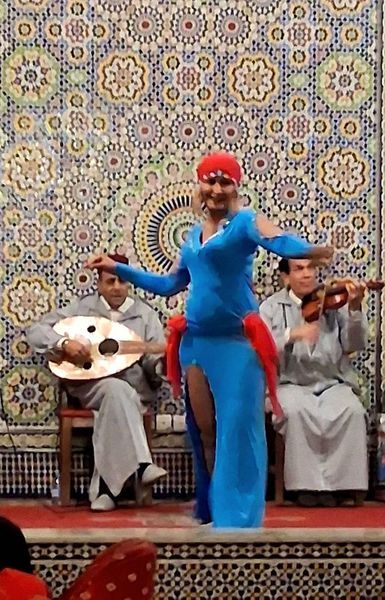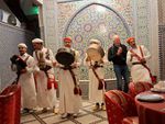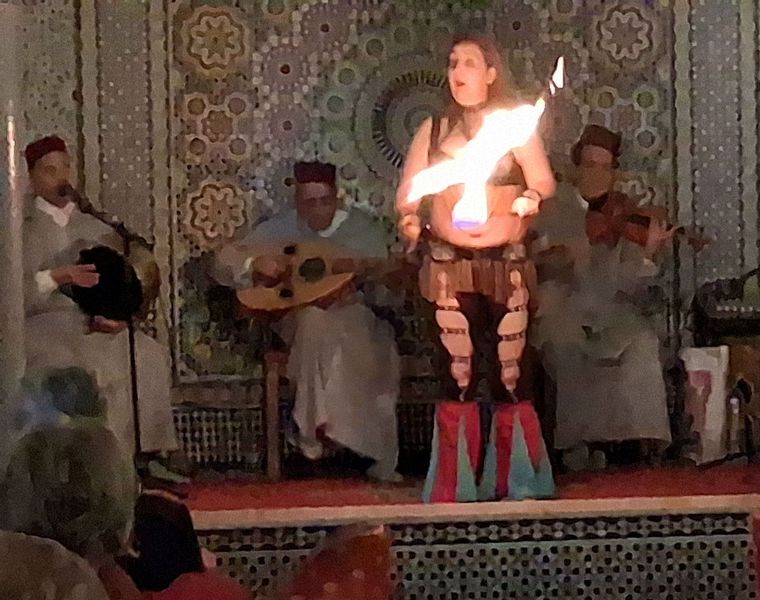 Am Abend um 20 Uhr werden wir zu einem Dinner mit Unterhaltung abgeholt. Das Lokal ist innen nach marokkanischer Art mit Fliesen und Mosaiken verziert, fast schon überladen.