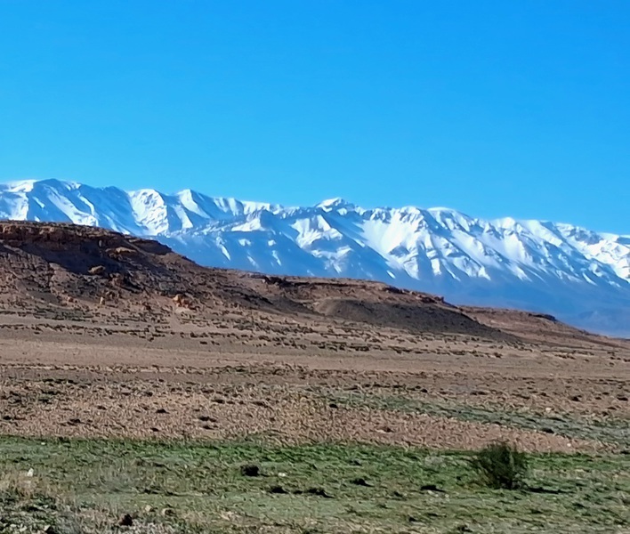 Bei 0 Grad machen wir uns auf den Weg. Im Hintergrund sieht man die Schnee bedeckten Berge des hohe Atlas. Die Straßen sind erstklassig und es gibt nur wenige Baustellen. Im Garmin sind noch die alten Straßen vorgemerkt, so werden wir des Öfteren aufgefordert zu wenden. An einer Straße auf der Hochebene kommt eine Tankstelle nach der anderen, also tanken wir auch mal zwischendurch, wer weiß wann die nächsten Tankstellen kommen.