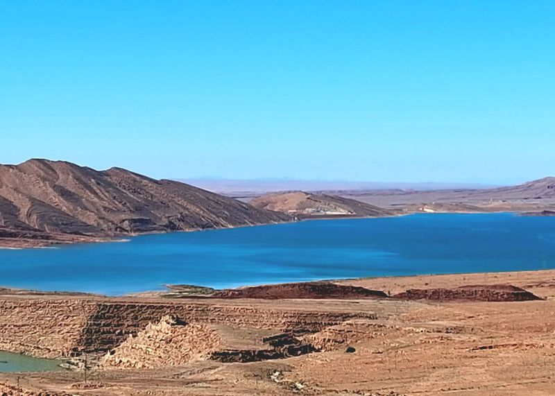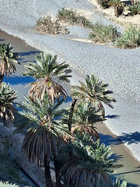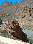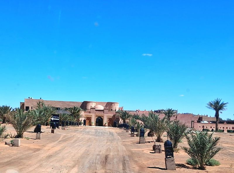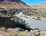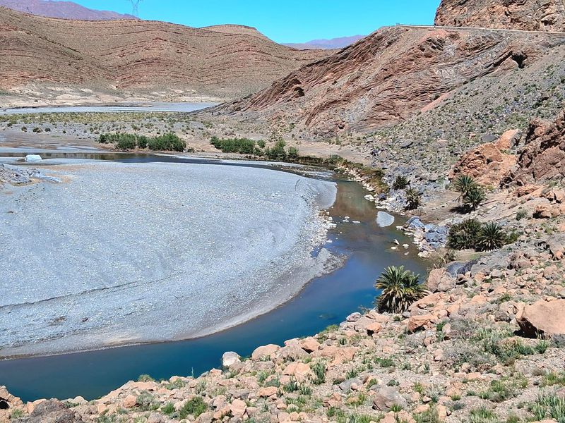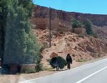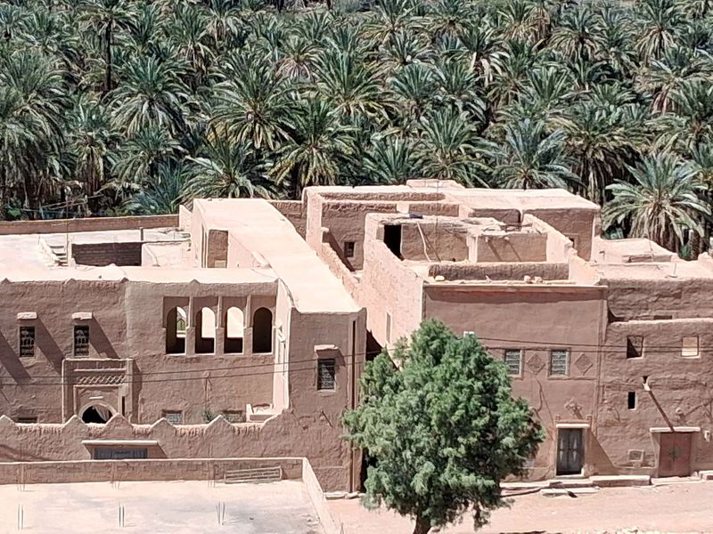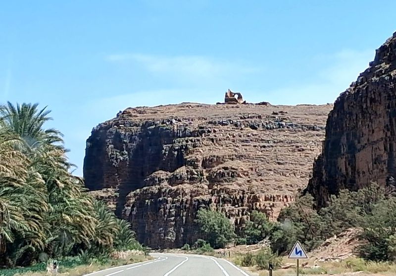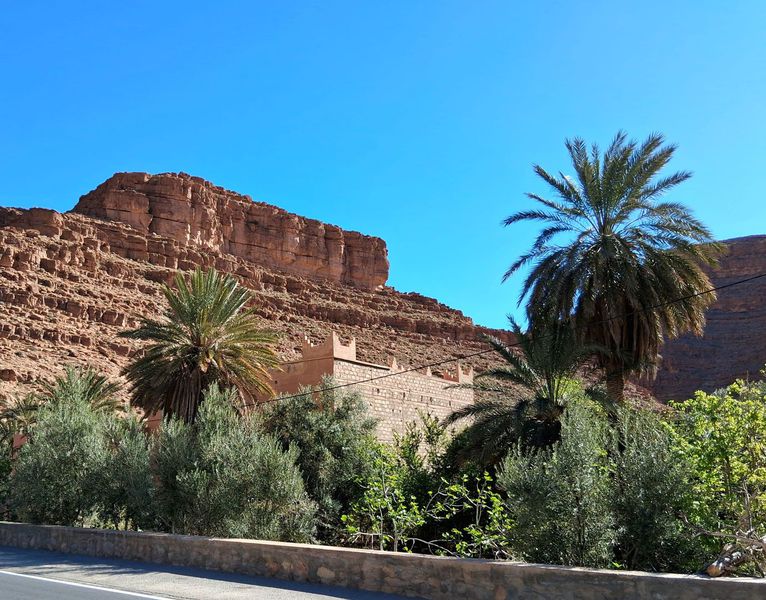 Nach kurzer Fahrt sehen wir einen riesigen Stausee, das Wasserreservoire für diese Gegend. Das "Ziz-Tal" geht dann in eine Oase über. Es gibt jede Menge Dattelpalmen und die typischen braun-beigen Siedlungen. Man kommt sich ständig wie in einer Filmkulisse vor.