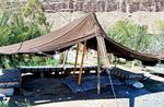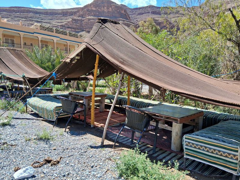Hier gibt es natürlich auch reichlich fliegende Händler mit Edelsteindrusen, gebastelten Dromedaren etc. Der Legionärstunnel ist nicht besonders spektakulär, ein kleiner Tunnel durch einen Felsvorsprung. Dann erreichen wir unser heutiges Ziel, ein Campingplatz in wunderschöner Landschaft, man fühlt sich fast wie in Arizona.