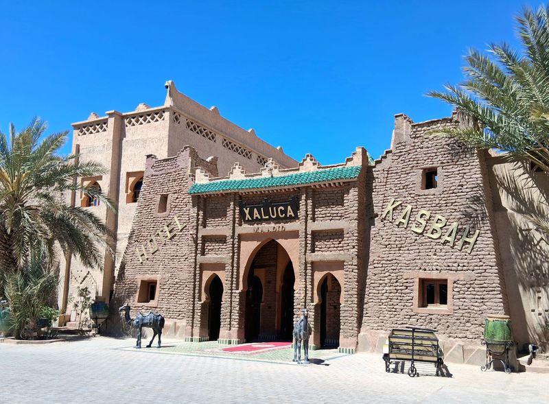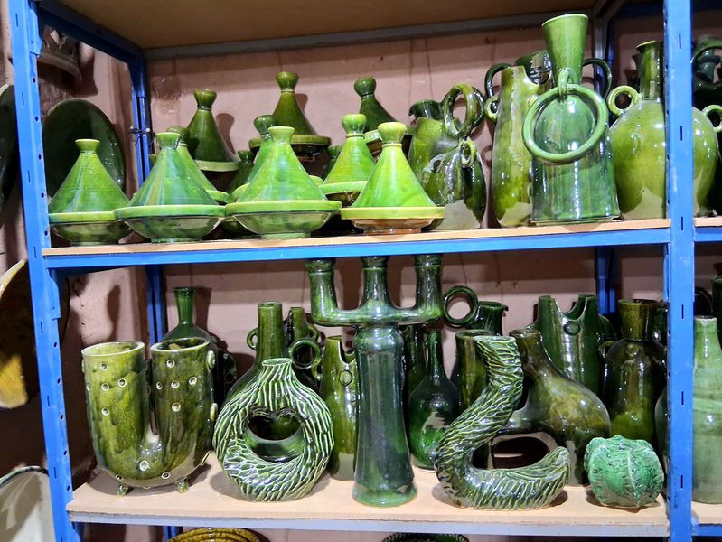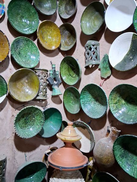 Dieser Ort ist bekannt für die „grünen Fliesen und Gefäße“. Wir werden durch die unterirdische Kasbah geführt und sehen auch einen Töpfer bei der Arbeit. Natürlich gibt es auch einen Cooperative mit Verkaufsshop. Die hier benutzten Farben sind alle ausschließlich aus Naturprodukten hergestellt. Ich konnte mir die verschiedenen Rezepturen nicht merken, nur Ansehen ist auch schön. Unser heutiges Ziel ist wieder der letzte Ort vor der Wüste, von hieraus sind es noch 25 km bis Algerien, dazwischen liegt nur Sandwüste. Entsprechend heiß, trocken und staubig ist es. Morgen ist hier für uns noch ein Ruhetag, schwitzen ist angesagt.