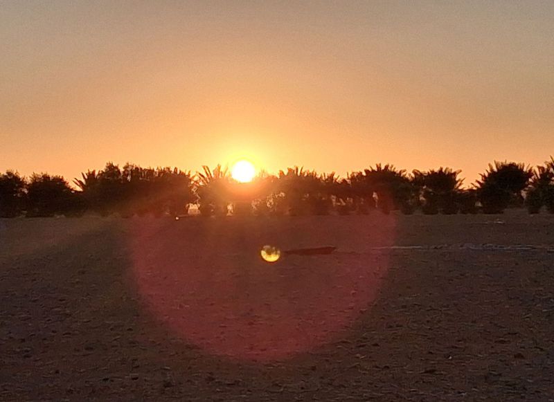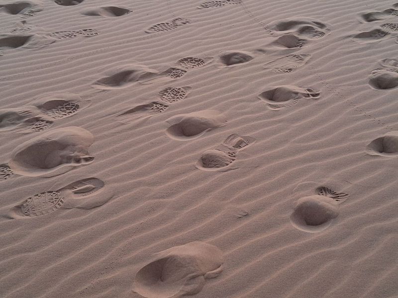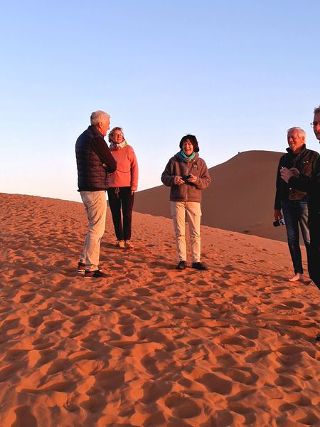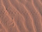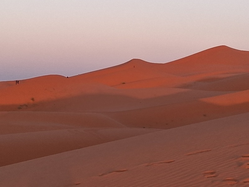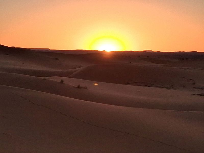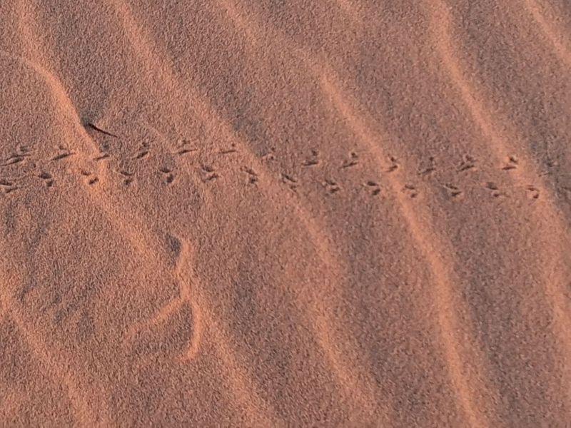Um 6 Uhr begibt sich die Karawane auf die Düne, um den Sonnenaufgang zu beobachten. Man meint immer, in der Wüste gäbe es kein Leben, weit gefehlt, im Sand sieht man viele Laufspuren von unterschiedlichsten Tieren. Dann ist die Sonne da und die Dünen werfen lange Schatten. Ein beeindruckendes Lichtspiel.