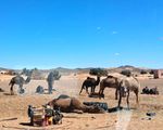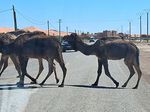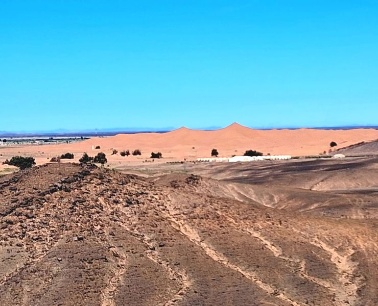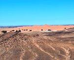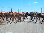 Dann tauchen am Horizont Dünen auf. Dromedare überqueren die Straße. Wir näher uns der Sahara. Links ab soll es zum Hotelstellplatz gehen. Es ist eine üble Schotterpiste, aber da Norbert vor uns ist, muss es wohl richtig sein.