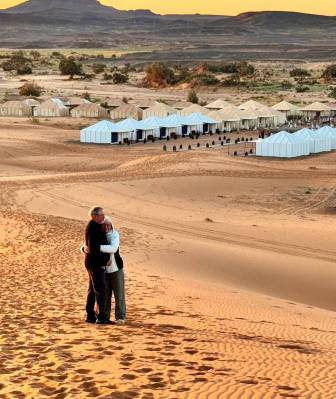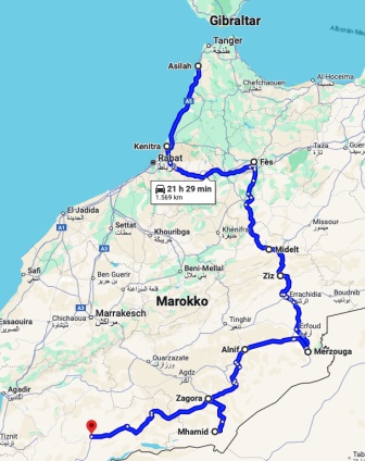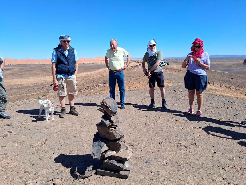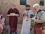 Rüdiger geht es ganz schlecht, er hat seit ein paar Tagen Verstopfung und schläft fast keine Nacht mehr. Phil vom Campingplatz weiß eine Apotheke in der Nähe und fährt mich hin. Irgendwie machen wir gemeinsam dem Apotheker klar, was wir wollen. Eine Art „Einlauf“ bekomme ich mit und entkrampfende Tabletten. Es hilft gar nicht, so fahren wir mit Norbert nach Zagora in die Klinik. Wir werden nur gefragt, ob es akut ist, dann wird der Pass vorgezeigt und das war die gesamte Formalität. Der Arzt ist sehr freundlich und verschreibt nun hoffentlich die richtigen Mittel. Nach der Frage nach dem Alter erhält Rüdiger die Aussage, dass in seinem Alter das völlig normal sei, nun gut! Heute Abend gibt es auf dem Campingplatz Couscous mit Rind und anschließend Folkloreprogramm mit Trommeln und Gesang. Und morgen geht es weiter durch die Wüste, heiß und sehr staubig.
