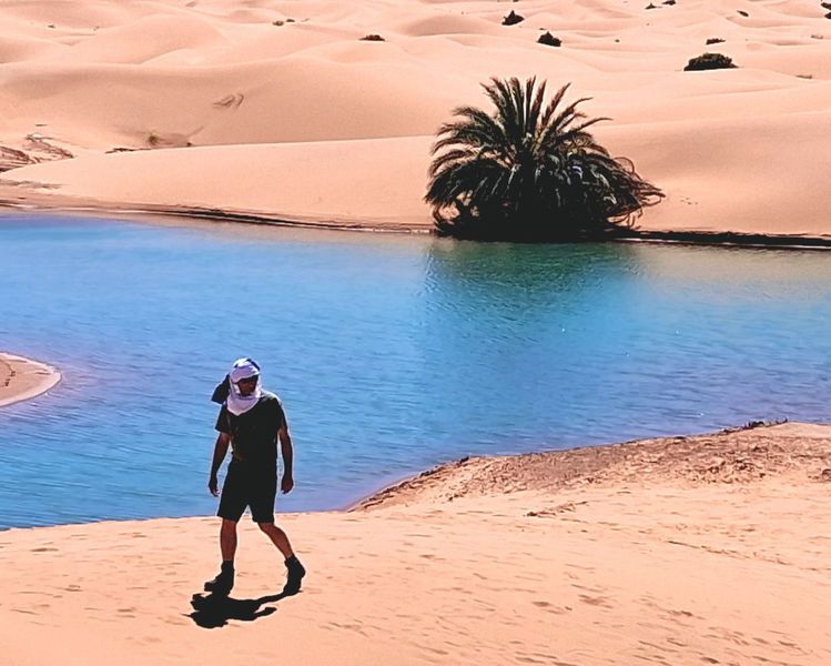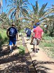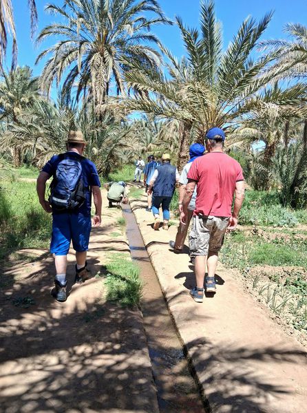 Weiter geht es zu einem Berberdorf. Wir werden auf einen Tee und etwas Gebäck eingeladen. Ein bis zweimal pro Jahr ziehen die Nomaden auch weiter. Nun wollen die Fahrer noch zeigen, was sie alles draufhaben. Ein wilder Ritt über die Sanddünen verlangt den Autos alles ab. Erstaunlich, dass keiner Seekrank wird. Am Rande der Wüste wandern wir noch an einem Bewässerungskanal entlang. Hier weiß man jeden Wassertropfen zu schätzen.