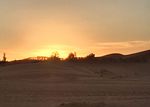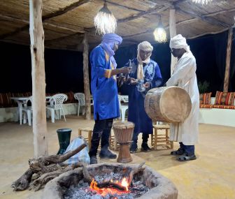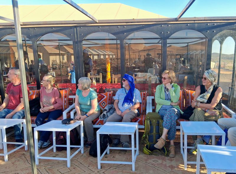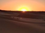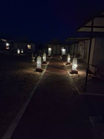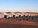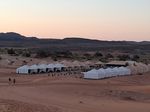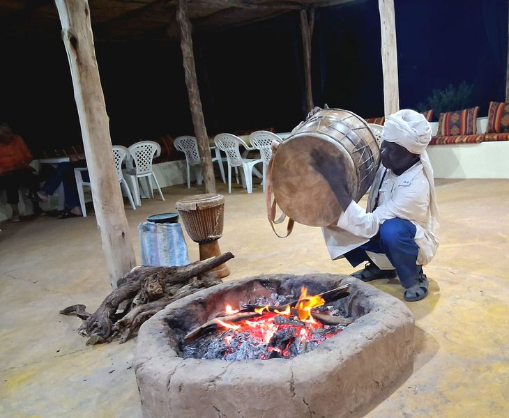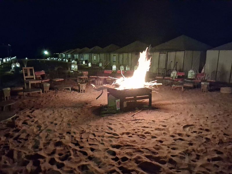 Um 17 Uhr werden wir zum Wüstencamp abgeholt. Nur 15 Minuten dauert die Fahrt, aber man sieht nichts mehr von Orten, nur viele Zeltcamps reihen sich an den Dünen entlang auf. Jeder hat ein eigenes Zelt mit Bad und kleiner Terrasse davor. Nach dem Begrüßungstee und kleiner Entspannungspause wird im großen Zelt zu Abend gegessen, natürlich erst nach Sonnenuntergang. Anschließend gibt es am Lagerfeuer Trommelfolklore, wir sind müde, es wird kalt, also gute Nacht.