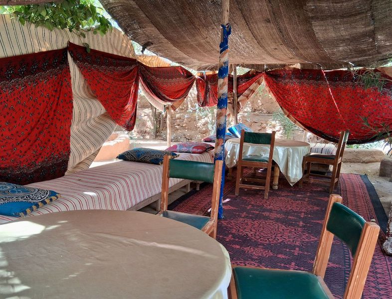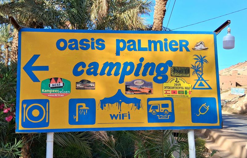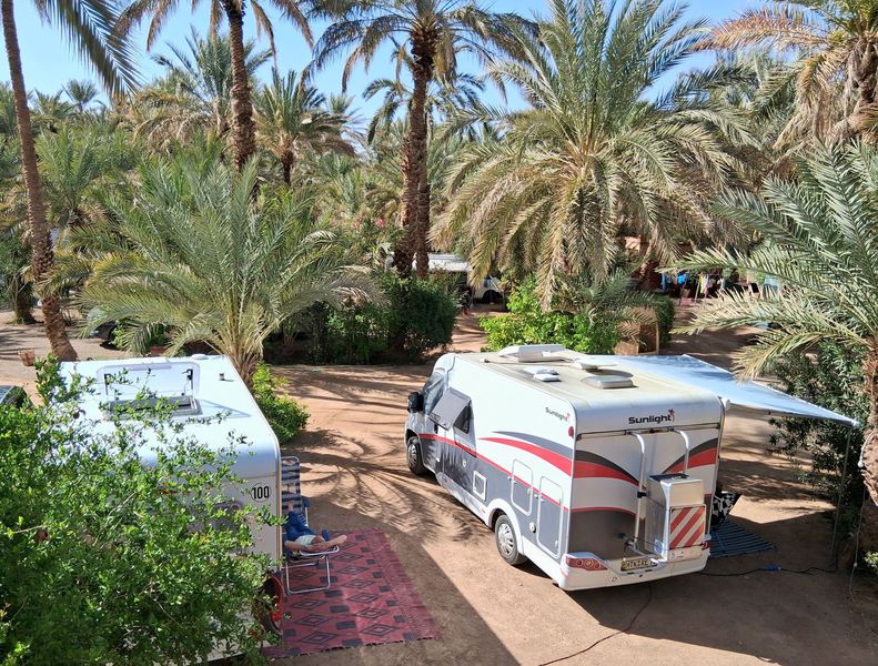 Endlich sehen wir wieder Palmen und auch Felder, wir sind im Tal der „Draa“. Eine Siedlung folgt der nächsten, eine Kasbah sieht verfallener aus wie die vorherige. Zagora ist dagegen eine große und sehr saubere Stadt mit breiten Straßen. Noch einmal links abbiegen, dann sind wir auf dem Campingplatz „Oasis Palmier“. Wir werden herzlich begrüßt, für jeden gibt es erstmal eine Flasche Wasser, dann werden wir auf einen idyllischen Platz eingewiesen, ein Teppich liegt sofort vor unserem Camper, wunderschön.