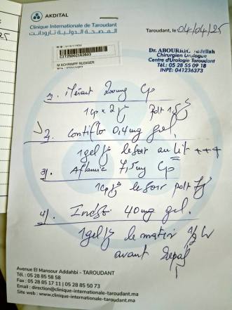 Die Stadt ist komplett von einer riesigen Mauer umgeben, sieht sehr interessant aus, aber alleine als Frau fühle ich mich doch etwas unwohl. Ich habe mir schon extra einen Pullover angezogen, um nicht so sehr aus dem Rahmen zu fallen, denn hier sind die Frauen alle verschleiert. Ich schaffe es trotzdem, ein paar Joghurt und Wasser zu kaufen, denn Rüdiger soll sehr viel trinken. Zurück im Zimmer zieht sich der Tag endlos. Der Doktor kommt gegen 17 Uhr und macht noch eine Ultraschalluntersuchung. Die nächste Operation wird am 17. April in Agadir stattfinden. Dort gibt es die Instrumente, die ihm hier noch fehlen. Er verspricht, dass dort der Service genauso gut ist wie hier und die Krankenschwestern genauso freundlich. Dann gibt er uns noch das Rezept für eine Menge Medikamente, erklärt genau, wann was einzunehmen ist. Wir tauschen die Telefonnummern aus und er bittet darum, dass wir ihn – egal ob Tag oder Nacht – bei Problemen sofort anrufen. So etwas kann man sich in Deutschland kaum vorstellen. Er besteht darauf, dass wir noch eine Nacht im Hospital bleiben, es werden noch ein paar Infusionen verabreicht.