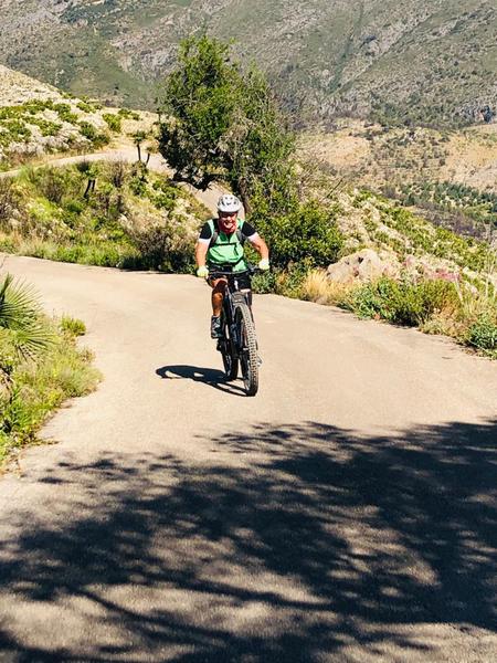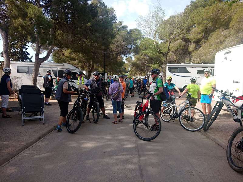 Montag mögen wir es wieder etwas sportlicher. Jeroen wird mit der Gruppe Richtung Sümpfe fahren, wir nehmen uns die Hügel im Hinterland vor. Die Ortsdurchfahrt von Oliva ist grauenhaft, ständig fährt man durch Einbahnstraßen und muss wieder Umwege fahren. Endlich haben wir es geschafft, durch ein Gewerbegebiet, wo offensichtlich einmal viele Ziegeleien waren, führt der Weg Richtung Berge. Mit einer moderaten Steigung kommen wir auf 200 Meter Höhe, dann geht es wieder ins Tal. In einem Bogen fahren wir nach Alzubia und dann den direkten Weg nach oben. Auf dem Berg ist ein weißes Haus zu sehen, ich sage noch: da fahren wir jetzt rauf. Die Reaktion von Andreas: das glaube ich nicht. Nach 4 km und 300 Höhenmeter kommen wir am weißen Haus vorbei. Die Straße hat in den Serpentinen mal locker 20 % Steigung. Und dann geht es genauso brutal wieder Berg ab. Die Aussichten entschädigen aber vollkommen. In Pego genießen wir Kaffee und Bier und landen anschließend in der Sumpflandschaft, auch interessant, aber natürlich flach. Für heute reicht uns die sportliche Einlage. Abends gibt es allgemeines Futtern zum Bergfest. Selbst Marianne taucht plötzlich auf, schwatzt etwas herum und verabschiedet sich wieder. Das muss jeder selbst wissen, ob er sich einer Gemeinschaft anschließen kann.