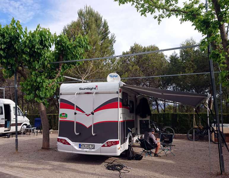 In der Frühe wird zusammengepackt und umgeparkt. Um 9:45 Uhr sind wir vier startklar. Heute kommen wir auch locker durch die Orte und die Bahntrasse ist leer. Dann kann man auch diese Trasse am Meer entlang genießen. Nach gut 20 km biegen wir Richtung Hügel ab. Heute sind auf der Strecke hinauf zum Kloster noch mehr Radler unterwegs, aber genauso wenig Autos wie beim letzten Mal. Wir alle genießen die schöne Strecke und die Ausblicke und sind nach gut 2,5 Stunden wieder am Camper. Es ist noch Zeit für ein Bier am Campingplatz, dann geht es Richtung Valencia in die Hügel zu unserem nächsten Ziel. Cecile erwartet uns schon an der Rezeption und erklärt uns den Terrassencampingplatz. Sehr schön gelegen und ein Genuss nach den beiden letzten Riesenplätzen. Freuen wir uns auf die nächsten Tage in schöner Natur.