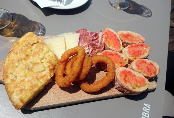 Richtung Küste rollen wir weiter, wollen aber vorher noch eine Kleinigkeit essen. In einer Kurve sehen wir ein Lokal, in dem etliche Spanier sitzen, da muss es gut sein. Und so ist es, eine Tapaplatte, 2 Bier, 2 Kaffee kosten nur 13,60 €, sensationell. Abends schwärmen wir von der Tour, Cecile und Jeroen fahren die Strecke am nächsten Tag und sind auch ganz begeistert.