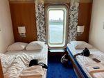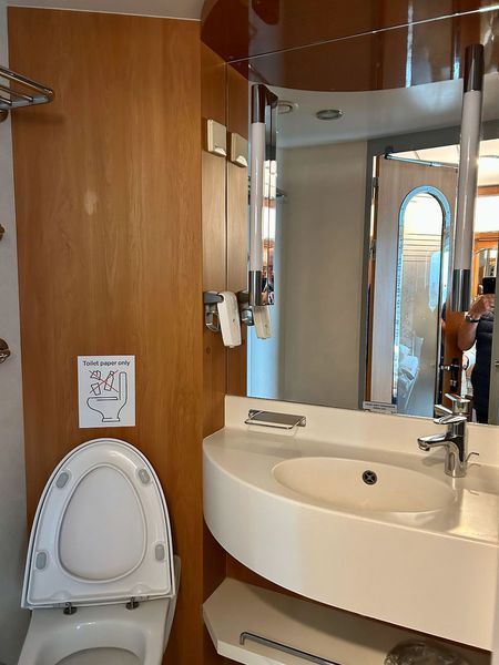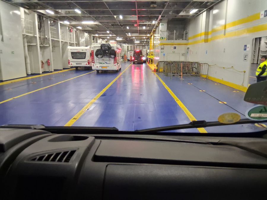 In der Warteschlange für den Check in stehen um 16:30 Uhr bereits fast alle Camper, Helma und Ben gehen von Auto zu Auto, besprechen was es zu sagen gibt und werden auf jeden Fall rechtzeitig fertig. Jeder bekommt bei der Durchfahrt der Kontrolle die Zugangskarte für seine Kabine. So edle Schiffskabinen hatten wir bisher noch auf keiner Fähre. Das Bad ist groß genug, sogar die Minibar ist gut gefüllt und ist im Preis inbegriffen. Das Essen ist auch für eine Fähre erstaunlich gut, jeder kann satt werden. Und bei Einbruch der Dunkelheit sind wir auf dem Wasser. Gute Nacht!