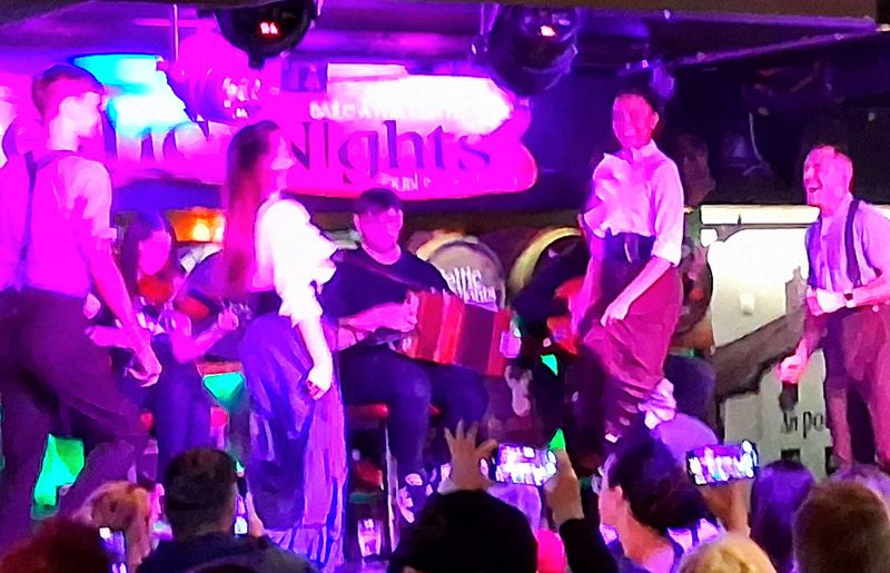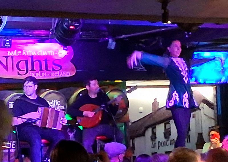 Um 17 Uhr geht es mit dem Bus nach Dublin hinein, es wird gegessen und anschließend gibt es Folklore. Der Fluss Lifey teilt die Innenstadt, direkt am Ufer gibt es das Hotel „Arlington“. Dort steigen wir ab ins Kellergewölbe, hier passen sicherlich 200 Besucher rein. Als Menü kann man zwischen 4 Vorspeisen und 4 Hauptgerichten wählen. Wir entscheiden uns für typisch irische Gerichte. Dann beginnt die Show. 3 Musiker mit Gitarren und Akordeon und eine Frau mit Geige spielen die typischen irischen Lieder. Später gibt es den ebenfalls typischen Stepptanz, 2 Männer und 2 Frauen geben wirklich ihr Bestes. Es ist ein schöner gelungener Abend und um 23 Uhr sind wir wieder auf dem Campingplatz.