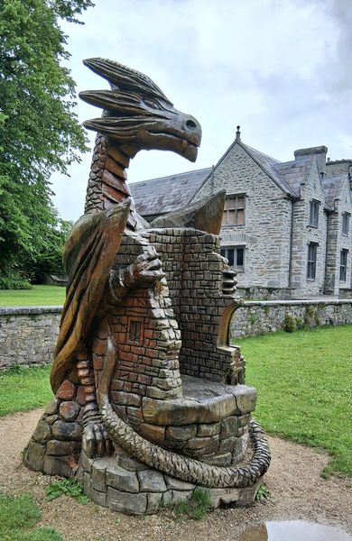 Die ersten Sonnenstrahlen machen und Mut, noch ein Schloss zu besichtigen. Leider beginnt es bei Mallow wieder an zu nieseln, aber das Schloss sehen wir uns trotzdem an. Eine alte Burgruine sieht etwas verfallen aus, über eine Treppe geht es hinauf zum Schloss, davor ein Brunnen und eine imposante Drachenstatue. Es gibt zwar auch noch einen großen Park, aber bei Regen nicht so schön.
