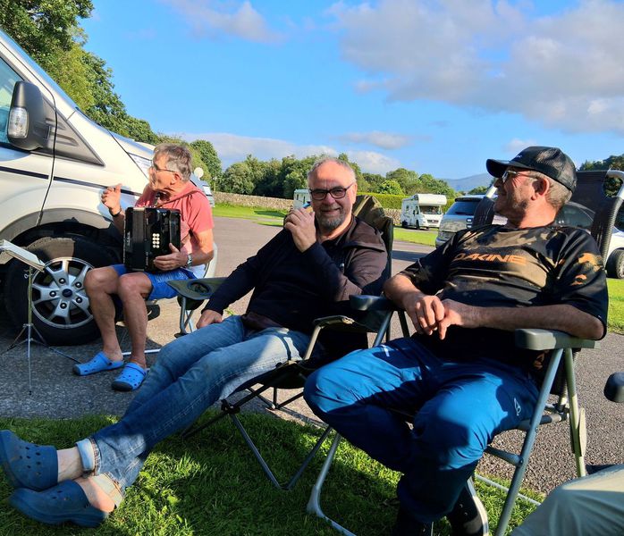 Bei der Weiterfahrt machen wir noch an einer großen Burg mit riesigem Park halt. Für die Besichtigung braucht man locker 2-3 Stunden, damit es sich lohnt. Für nur 1 Stunde ist der Eintritt zu hoch. Also geht es weiter zum Campingplatz nach Doolin, direkt am Meer gelegen. Heute Abend ist Bergfest, also werden Tische und Stühle aufgebaut und jeder steuert dem leckeren Buffet etwas bei. Es wir bei gutem Wetter mal wieder ein fröhlicher Abend.