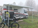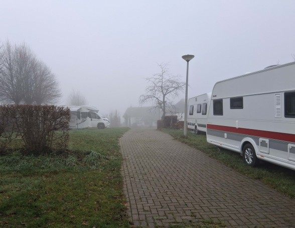Es ist wieder trübe, aber es geht in den Urlaub, also alles positiv! Der Camper wird gefüllt, erst mit Wasser, dann mit Lebensmitteln und den restlichen Utensilien, die wir meinen zu benötigen und auf geht’s. Obwohl es Feiertag ist und noch nicht mal 11 Uhr sind erstaunlich viele Autos unterwegs. In der Eifel gibt es endlich einen Lichtblick, die Sonne kommt raus. Erst bei Köln haben wir wieder Hochnebel. Von der Autobahn runter wird es plötzlich etwas hügelig, in Serpentinen führt die Straße den Berg hinab, dann sind wir am Campingplatz „Rozenhof“, klein und gemütlich. Wir richten uns ein, holen uns abends zwei riesige Portionen Essen, das reicht auch noch für morgen. Dann freuen wir uns auf eine schöne Radtour, die wir für morgen geplant haben.