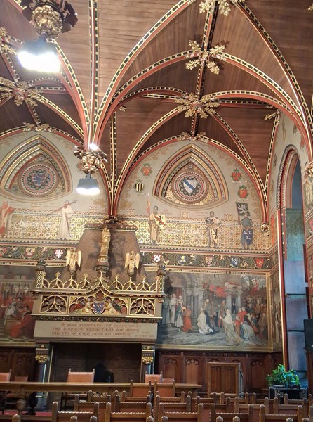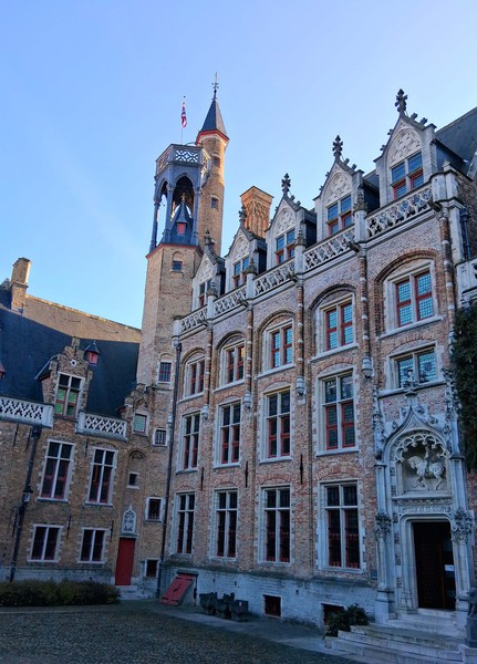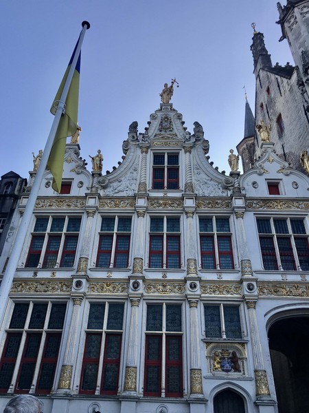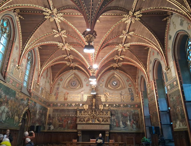 Erste große Besichtigung ist das „Rathaus“ mit einem wunderschönen Saal, in dem auch Hochzeiten stattfinden. Hochzeitsgesellschaften dürfen auch mit ihren Autos auf den Vorplatz fahren, sonst ist hier nur Fußgängerzone. In einem Nebenraum ist ein großes Modell von Brügge und den Häfen an der Küste aufgebaut. Mit verschiedener Beleuchtung wird die Veränderung der Landschaft und der Kanäle über die Jahrzehnte gezeigt.
