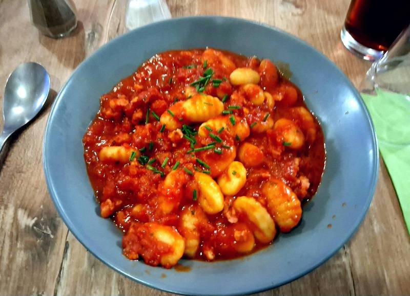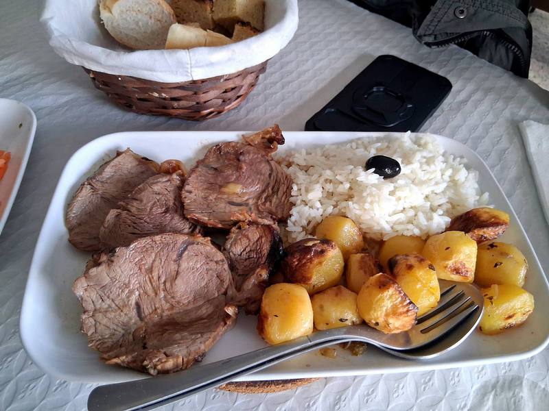 Um 15 Uhr ist das Restaurant offen, wir sind zwar die einzigen Gäste, das stört uns aber nicht. Wir essen leckeren Fisch mit Couscous, Bratkartoffeln und Kalbfleisch, Salat. Das ist reichlich genug für den Rest des Tages!