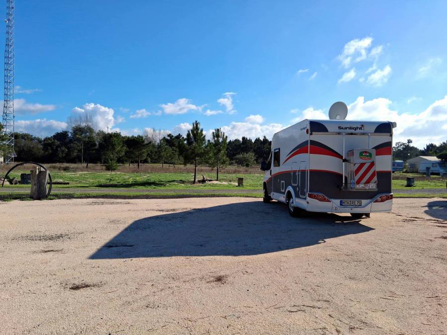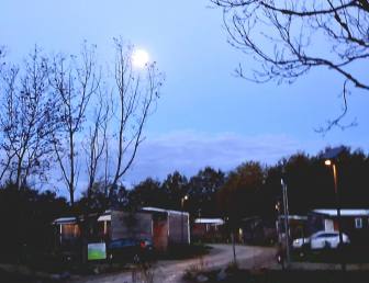 Morgens scheint noch der Mond auf unseren Camper herunter. Also ist der Himmel klar und bis zum Mittag scheint sogar öfter die Sonne. Auf der Fahrt nach La Rochelle kommen wir bis zu einem kleinen Dorf gut voran, dann staut es sich. Warum bloß? Hinter dem Ort steht die Polizei auf einem Parkplatz und regelt den Verkehr. Grund für den Stau ist ein riesiger Katamaran, der als Schwertransport ans Meer gebracht werden soll. Wir können vorbeifahren und sehen, dass die Polizei den Gegenverkehr runterbremst. Dann kommen wir wieder schnell vom Fleck. Nächstes Problem: ich habe im Navi den nächsten Campingplatz eingegeben und den Hafen von La Rochelle als Zwischenstopp, ein Fehler. In der Stadt kann man die Hin- und Rückroute nicht gut auseinanderhalten. So landen wir auf einem Parkplatz, der zu weit vom Hafen entfernt ist. Also löschen wir den Hafen und fahren weiter zum Campingplatz. Das Navi macht dann auch noch Probleme und zeigt Fehler an. Also Navigation erstmal mit dem Handy. Auf der Autobahn starten wir das Navi nochmal neu und siehe da, jetzt läuft es wieder. Mit Nieselregen geht es Richtung Bordeaux, noch schnell einkaufen und tanken und dann kommen wir – wieder im Trockenen – auf dem Campingplatz an.
