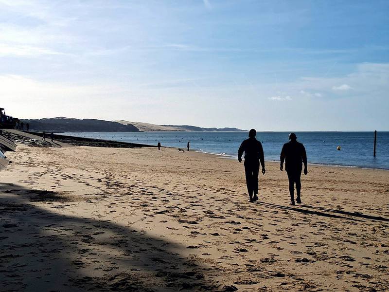 Traumwetter heute, morgens ist es zwar noch kalt, aber mittags in der Sonne steigt das Thermometer locker auf 20 Grad. Wir radeln erst Richtung Düne und wie befürchtet ist am Sonntag jede Menge Verkehr. Menschenmassen pilgern die Düne hinauf. Wir fahren durch die Seitengassen und haben auch einen herrlichen Blick auf den Strand und die Düne.