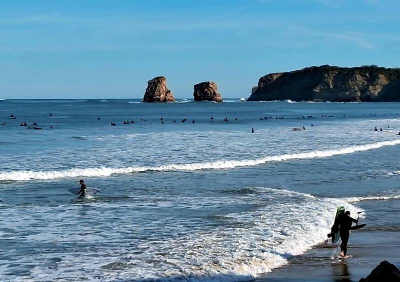 Hier brodelt das Leben und am Meer angekommen wissen wir auch, warum hier so viele Leute sind. Die Wellen rollen auf die Küste zu, der Strand ist voller Surfer. Wir können uns gar nicht satt sehen.